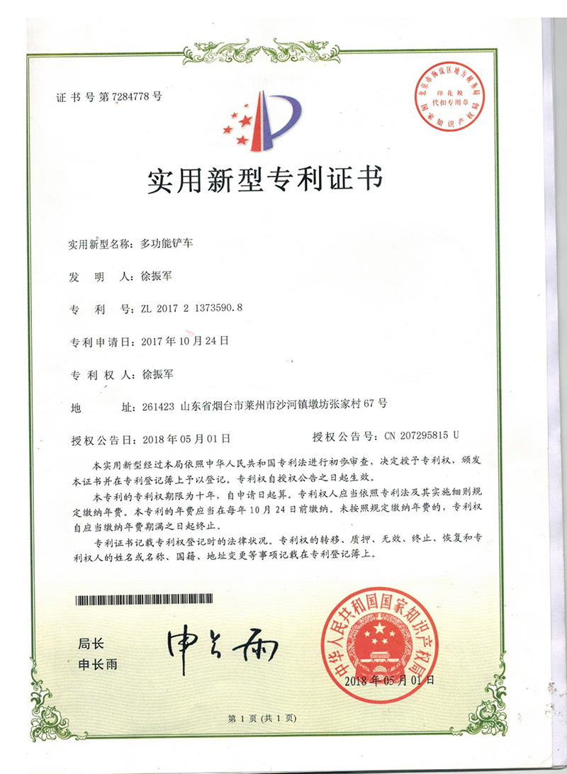 • 獲得“多功能鏟車抓掉挖一體機(jī)”專利證書,開始生產(chǎn)兩頭忙,攪拌斗裝載機(jī),同年更名萊州巨浪機(jī)械有限公司